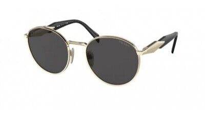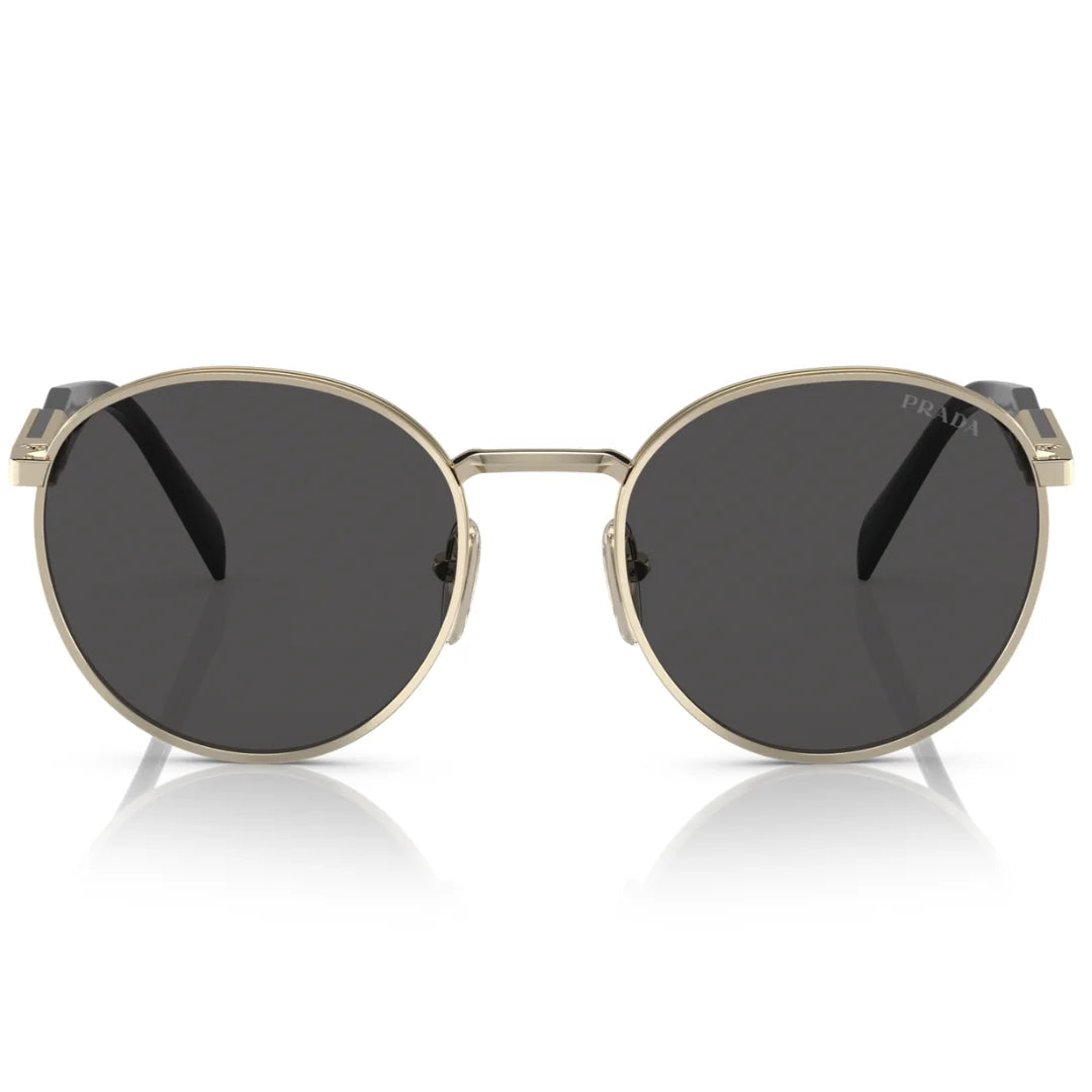 The Prada PR 56ZS ZVN 5S0 sunglasses feature a sophisticated round frame in pale gold, complemented by dark grey lenses. Designed for women, these sunglasses offer a timeless and elegant look, suitable for various occasions.