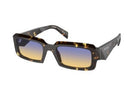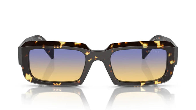 Stylish rectangular sunglasses featuring a black malt tortoise acetate frame with clear yellow to dark blue gradient lenses, offering a modern and sophisticated look.