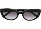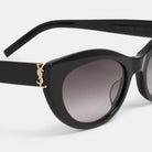 These Saint Laurent SL M115 002 sunglasses feature a full acetate cat-eye frame in black, offering a modern twist on a classic design. The frames are adorned with the iconic YSL monogram logo on the hinges, adding a touch of luxury. Grey gradient lenses provide 100% UV protection, ensuring eye safety.