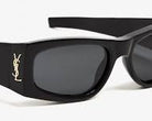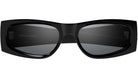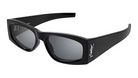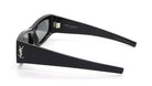 These Saint Laurent SL-M140 002 sunglasses feature a rectangular frame crafted from recycled acetate in a shiny black finish. They are adorned with the iconic Saint Laurent logo on the temples. The lenses are solid grey with a mirror silver coating, providing 100% UVA/UVB protection.