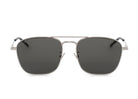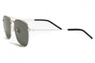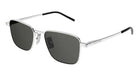 These square sunglasses by Saint Laurent feature a sleek silver-tone metal frame complemented by grey lenses. Designed with a thin full-rim encompassing the lenses, they include a slightly curved bridge and a top bridge for added style. The silver-toned metal arms connect at the temples, each engraved with the Saint Laurent logo, adding a touch of luxury to your ensemble.