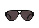 These Bottega Veneta BV1318S sunglasses feature a sleek black recycled acetate aviator frame with black temples, complemented by solid grey lenses. The lenses are crafted from bio-nylon, providing UV protection. The minimalist design and subtle branding add a touch of Italian luxury to any ensemble.