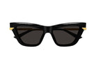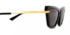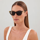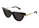 These sunglasses feature a feminine cat-eye design with a full-rim recycled acetate frame in a Havana color. The temples are crafted from lightweight metal and are adorned with Bottega Veneta's iconic double ribbon motif. Equipped with brown lenses, they offer 100% UV protection. The frame's sharp and bold front, combined with the geometric temple shape, adds a touch of sophistication to any look.