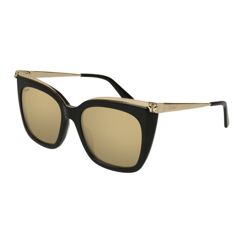 Introducing the Cartier Panthère de Cartier Cat-Eye Sunglasses, a fusion of timeless elegance and contemporary flair. Crafted with a smooth golden-finish metal frame, these sunglasses feature a distinctive cat-eye shape that adds a touch of vintage glamour. The golden mirror-effect lenses provide 100% UV protection, ensuring both style and eye safety. Embellished with the iconic Panthère motif on the temples, these sunglasses are a testament to Cartier's legacy of luxury and sophistication.