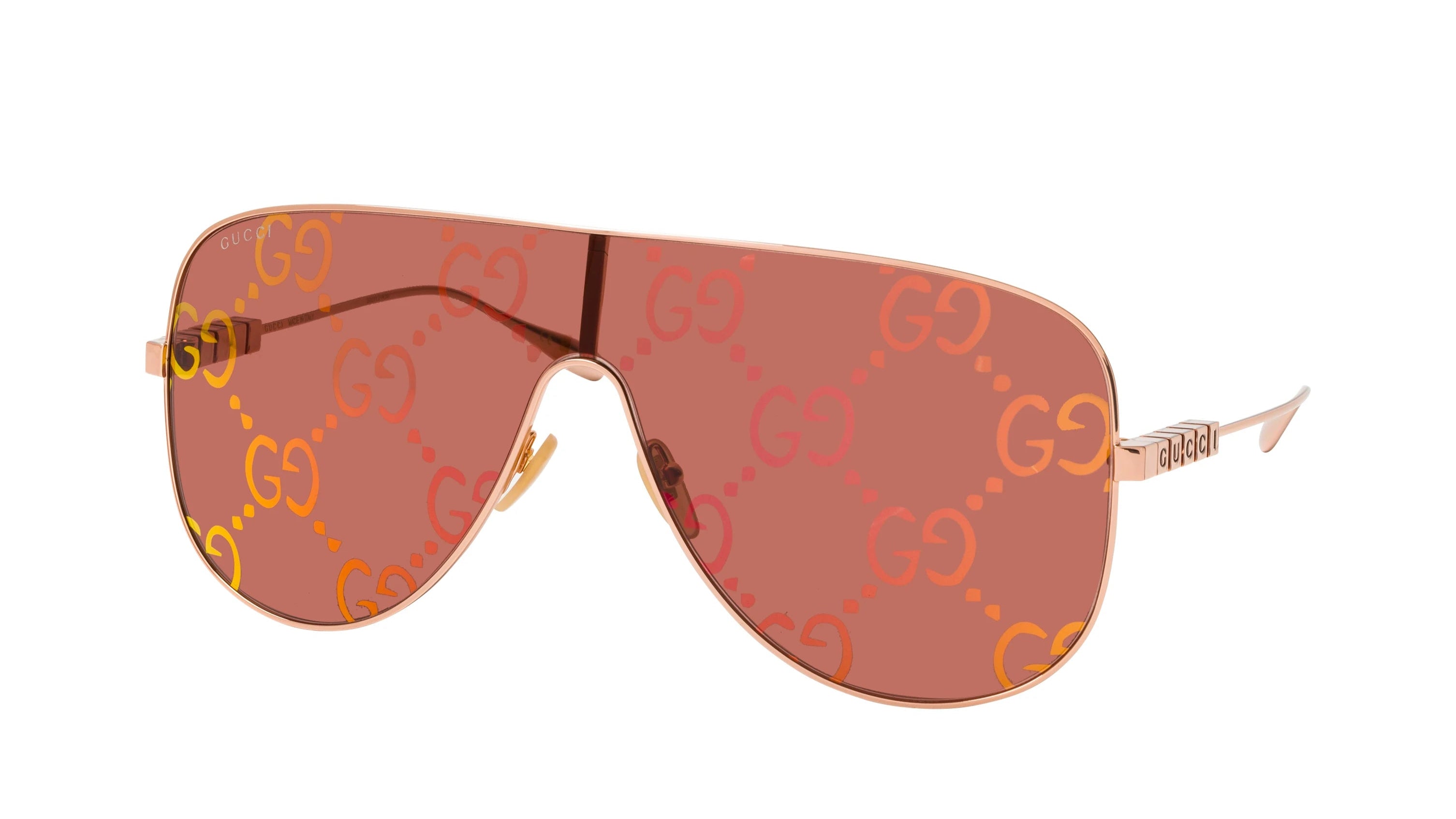 For the Pre-Fall 2023, these sunglasses are defined by a mask shape. Crafted from rose gold-toned metal, the silhouette is embellished by a Gucci lettering along the temples. Guccissima red lens completes the design.
