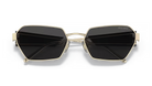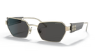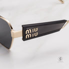 The Miu Miu MU 53WS ZVN5S0 sunglasses exemplify a fusion of contemporary design and timeless elegance. Featuring a pale gold-tone metal frame with a distinctive geometric shape, these sunglasses are complemented by dark grey lenses that provide 100% UV protection. Designed for fashion-forward women, they add a touch of sophistication to any ensemble.