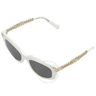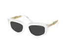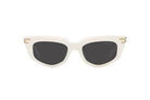The Miu Miu MU12WS 1425S0 sunglasses feature a stylish cat-eye design with a white acetate frame and dark grey lenses. These sunglasses blend vintage-inspired aesthetics with modern luxury, making them a versatile accessory for various outfits.