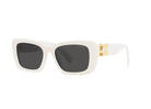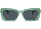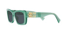 The Miu Miu MU07YS-19L09T 53 sunglasses feature a sleek rectangular design crafted from high-quality opal anise acetate, complemented by dark grey lenses. The temples are adorned with the Miu Miu logo, adding a touch of signature elegance. Designed for women, these sunglasses provide 100% UV protection, ensuring both style and functionality.